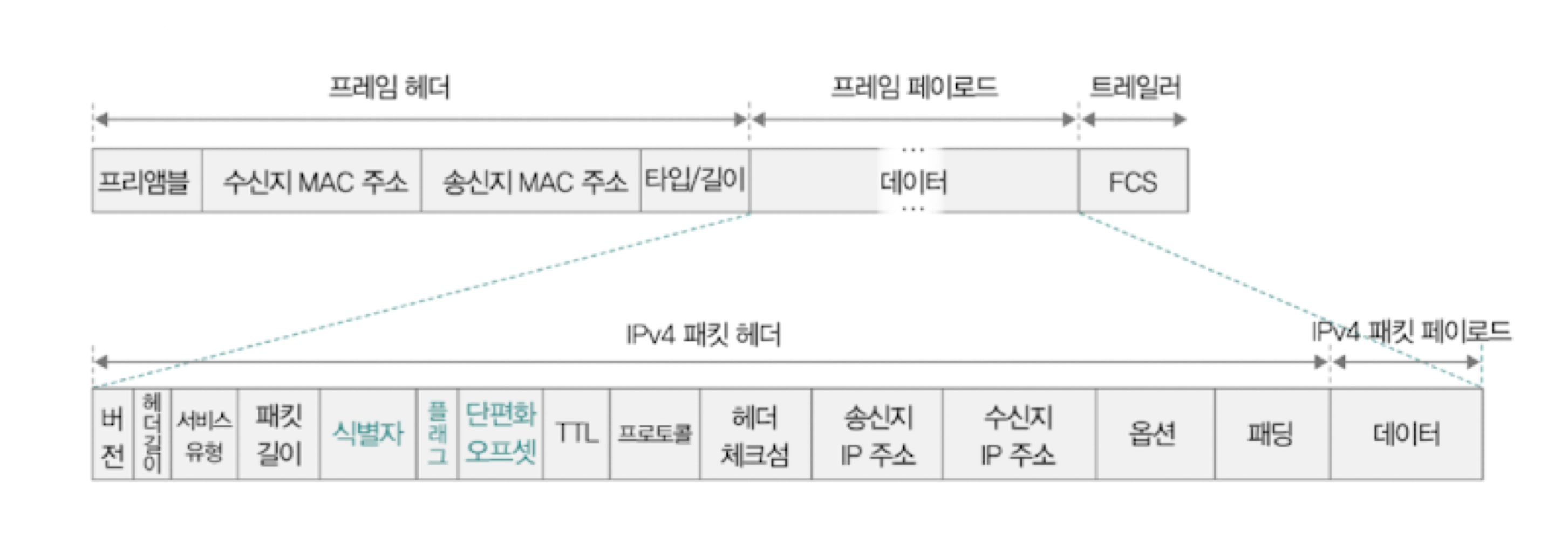 1. 식별자: 특정 패킷이 어떤 데이터에서 쪼개진 패킷인지를 식별하기 위해 사용되는 필드이다. 같은 정보에서 쪼개진 패킷들은 같은 식별자를 공유하기 때문에 식별자를 통해 단편화되어 전송되는 패킷을 구분할 수 있음