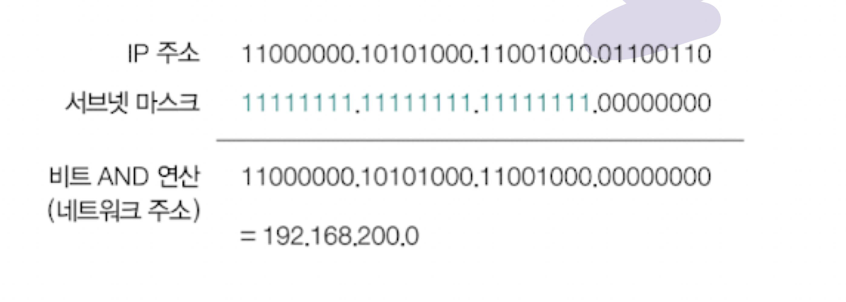 서브넷 마스크와 IP 주소간에 비트 AND 연산을 수행하면 IP 주소내의 네트워크 주소를 알아낼수있다