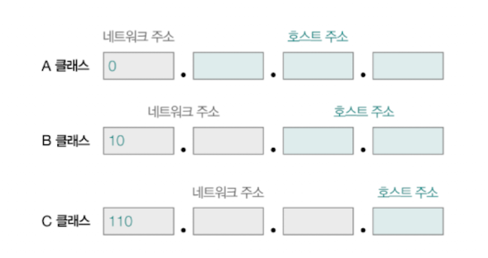 - C클래스의 네트워크 주소는 비트 110으로 시작해 3옥텟으로 구성되며 호스트 주소는 1옥텟으로 구성된다.