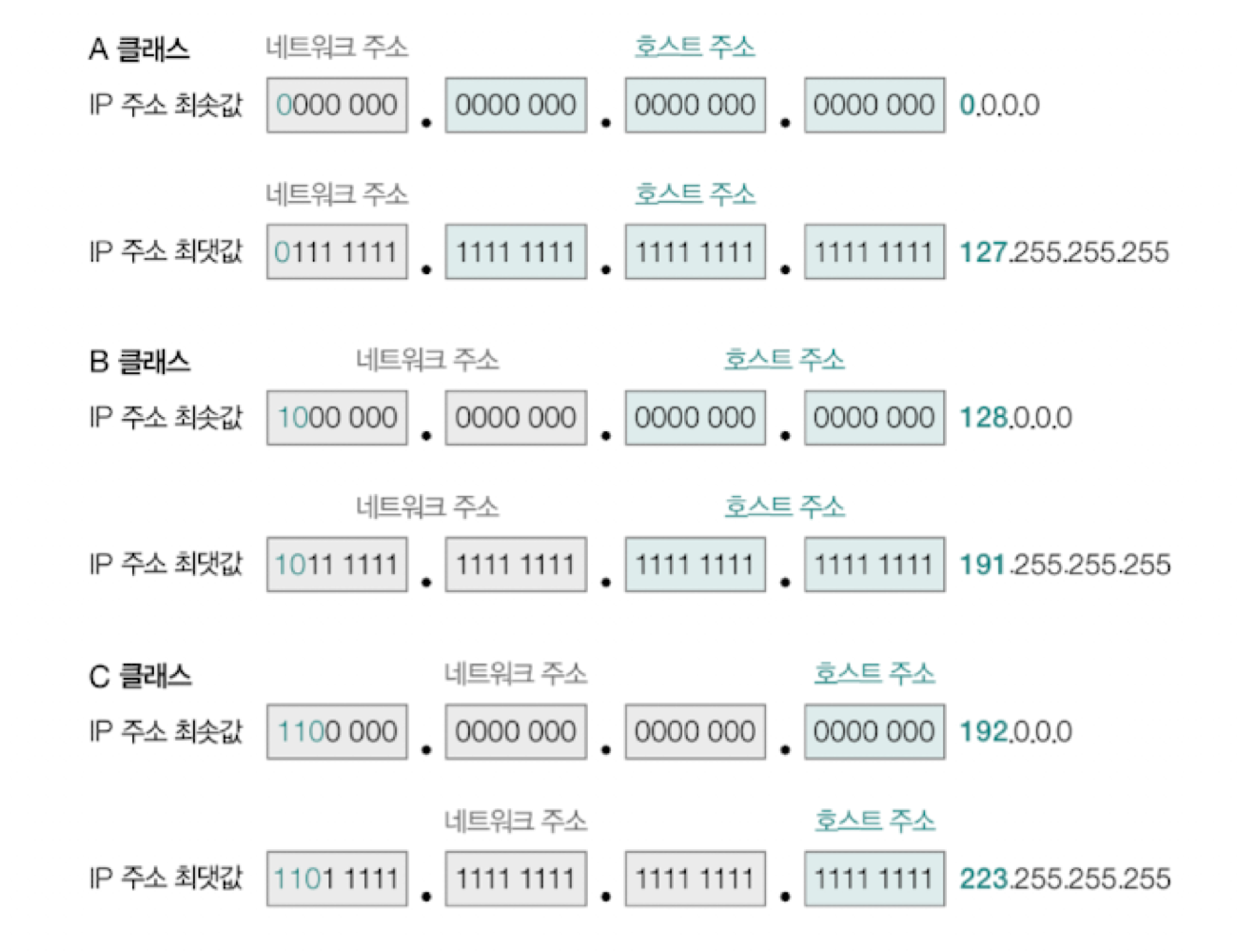 - A 클래스: 0.0.0.0 ~ 127.255.255.255