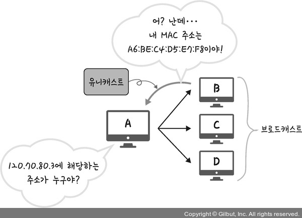 - 장치 A가 ARP Request 브로드캐스트를 보내서 IP 주소인 120.70.80.3에 해당하는 MAC 주소를 찾는다.