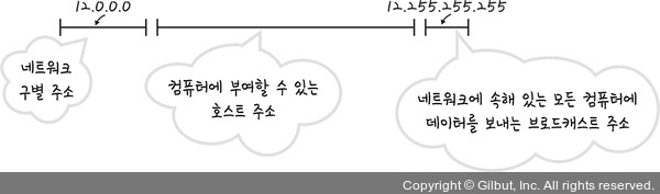 근데 첫번째 주소인 12.0.0.0은 네트워크 구별 주소로 사용하면 안댐